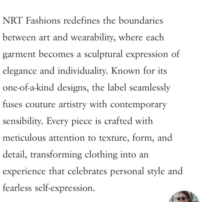 'NRT Fashions is emerging as a recognizable voice of contemporary luxury, where wearable art intertwines with everyday elegance. Since its founding in 2014 the brand has been defined by bold, unique pieces that blur the boundaries between couture fashion and ready-to-wear, creating garments that capture attention and spark dialogue. Each creation reflects an intuitive design approach, combining sculptural forms, unexpected textures, and refined details-all with the aim of highlighting the individuality of the wearer. In the world of NRT, Fashion is not merely something we wear, but an experience.
